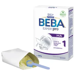 BEBA® EXPERTpro HA 1 ist eine Säuglingsnahrung für Neugeborene. Sie enthält eine einzigartige Kombination aus teilhydrolysiertem Protein, gewonnen durch das OPTIPRO® HA-Verfahren, L. reuteri-Bakterien, Vitaminen* und Mineralstoffen*, um den Bedürfnissen Ihres Babys gerecht zu werden. *Gemäß den Anforderungen der geltenden Gesetzgebung. Wir sind Experten auf dem Gebiet der Säuglingsernährung und entwickeln unsere Rezepturen stetig weiter, um Ihren Kleinen nur das Beste zu bieten. Die Säuglingsnahrung mit teilhydrolysiertem Protein finden Sie im Regal in silberner Verpackung mit dem EXPERTpro HA-Label. BEBA® EXPERTpro HA 1 Säuglingsnahrung enthält eine Kombination einzigartiger Inhaltsstoffe, deren Wirksamkeit klinisch nachgewiesen ist: - Darmbakterien L. reuteri - Milchsäurebakterien, die in der Darmflora gestillter Säuglinge vorkommen - Teilweise hydrolysiertes Protein - OPRIPRO HA® - ein spezielles Verfahren zur Gewinnung von 100 % teilweise hydrolysiertem Molkenprotein - OHNE Palmöl Zusammensetzung: LAKTOSE (aus MILCH), pflanzliche Öle (Sonnenblumenöl mit hohem Ölsäuregehalt, Rapsöl mit niedrigem Erucasäuregehalt, Sonnenblumenöl), enzymatisch hydrolysiertes MOLKENproteinkonzentrat, Mineralstoffe (Kaliumsalze der Orthophosphorsäure, Calciumsalze der Citronensäure, Kaliumchlorid, Magnesiumchlorid, Natriumchlorid, Eisensulfat, Zinksulfat, Kupfersulfat, Mangansulfat, Kaliumiodid, Natriumselenat), Cholintartrat, Mortierella alpina Öl, Schizochytrium sp. Mikroalgenöl, L-Arginin, Vitamine (Natrium-L-ascorbat, Calcium-D-pantothenat, Nicotinamid, DL-alpha-Tocopherylacetat, Riboflavin, Thiaminmononitrat, Retinylacetat, Pyridoxinhydrochlorid, Folsäure, Phyllochinon, D-Biotin, Cholecalciferol, Cyanocobalamin), L-Histidin, L-Phenylalanin, Milchsäurebakterien (Limosilactobacillus reuteri DSM 17938¹; 8,9 x 10⁷ KBE / 100 g Pulver am Ende der Mindesthaltbarkeit), Inositol, Taurin, Nukleotide [Cytidin-5′-monophosphat (CMP), Natriumsalze von Uridin-5′-phosphat (UMP), Adenosin-5′-phosphat (AMP), Natriumsalze von Guanosin-5´-phosphat (GMP)], L-Carnitin. ¹Lizenz von BioGaia AB. ALLERGENE SIND IN GROSSBUCHSTABEN HERVORRAGEND. Pro 100 g Pulver: Energie: kJ / kcal 2138 / 511 Fett: g 26 davon: gesättigte Fettsäuren: g 2,4 - einfach ungesättigte Fettsäuren: g 17 - mehrfach ungesättigte Fettsäuren: g 4,7 davon: Linolsäure: g 3,8 - Alpha-Linolensäure: g 0,3 - Arachidonsäure: mg 130 - Docosahexaensäure: mg 130 Kohlenhydrate: g 59 davon: Zucker: g 59, davon Laktose: g 59 Eiweiß: g 9,7 Salz: g 0,48. Mineralstoffe: Natrium: 190 mg, Kalium: 635 mg, Calcium: 336 mg, Phosphor: 186 mg, Magnesium: 50,0 mg, Mangan: 115 µg, Selen: 28 µg, Eisen: 5,4 mg, Jod: 103 µg, Kupfer: 0,37 mg, Zink: 3,8 mg, Chloride: 395 mg, Fluoride: <60 µg. Vitamine: Vitamin A: 440 µg, Vitamin D: 11 µg, Vitamin E: 12 mg, Vitamin K: 37 µg, Vitamin C: 70 mg, Thiamin: 0,50 mg, Riboflavin: 1,1 mg, Niacin: 4,9 mg, Vitamin B6: 0,36 mg, Folsäure: 150,0 µg DFE, Pantothensäure: 5,4 mg, Vitamin B12: µg 1,4 Biotin / Biotin: µg 13 Cholin / Cholin: mg 175 Inositol / Inositol: mg 34 Taurin / Taurin: mg 29 Carnitin / Carnitin: mg 12 Nukleotide: mg 15,0. Zubereitung: 1. Waschen Sie Ihre Hände gründlich, bevor Sie die Säuglingsnahrung zubereiten. 2. Reinigen Sie Flasche, Verschluss und Sauger gründlich und kochen Sie sie 5 Minuten lang aus. Beachten Sie bei Verwendung eines Dampfsterilisators die Gebrauchsanweisung. 3. Kochen Sie für Säuglinge geeignetes Trinkwasser 5 Minuten lang ab und lassen Sie es abkühlen. 4. Geben Sie die Hälfte des abgekochten Wassers (siehe Tabelle), das auf ca. 40 °C abgekühlt ist, in den Behälter. Wassertemperaturen über 45 °C zerstören Milchsäurebakterien. 5. Geben Sie das Pulver mit dem beiliegenden Messbecher (siehe Tabelle) in den Behälter. Der Messbecher muss immer bis zum Rand gefüllt sein! 6. Gut schütteln. 7. Füllen Sie den Behälter mit der restlichen Hälfte des abgekochten Wassers (siehe Tabelle) auf. 8. Nochmals gut schütteln, bis sich das Pulver vollständig aufgelöst hat. 9. Die Temperatur der zubereiteten Nahrung prüfen. 10. Nach jedem Gebrauch die Verpackung fest verschließen und an einem trockenen Ort bei Raumtemperatur aufbewahren. DOSIERUNG: Menge für 1 Mahlzeit: - Alter des Kindes 1. und 2. Woche: 90 ml abgekochtes Wasser, Anzahl gestrichener Messbecher² 3, Anzahl der Mahlzeiten pro Tag 6, Anzahl der Portionen Beikost³ -; - Alter des Kindes 3. und 4. Woche: 120 ml abgekochtes Wasser, Anzahl gestrichener Messbecher² 4, Anzahl der Mahlzeiten pro Tag 5, Anzahl der Portionen Beikost³ -; - Alter des Kindes 2. Monat: 150 ml abgekochtes Wasser, Anzahl gestrichener Messbecher² 5, Anzahl der Mahlzeiten pro Tag 5, Anzahl der Portionen Beikost³ -; - Alter des Kindes im 3. und 4. Monat: 180 ml abgekochtes Wasser, Anzahl gestrichener Messbecher² 6, Anzahl der Mahlzeiten pro Tag 5, Anzahl der Portionen Beikost³ -; - Alter des Kindes im 5. und 6. Monat: 210 ml abgekochtes Wasser, Anzahl gestrichener Messbecher² 7, Anzahl der Mahlzeiten pro Tag 5, Anzahl der Portionen Beikost³ -; - Alter des Kindes im Alter von 7 bis 9 Monaten: 210 ml abgekochtes Wasser, Anzahl gestrichener Messlöffel² 7, Anzahl der Mahlzeiten pro Tag 4-3, Anzahl der Beikostmahlzeiten³ 1-2; - Alter des Kindes ab 10 Monaten: 210 ml abgekochtes Wasser, Anzahl gestrichener Messlöffel² 7, Anzahl der Mahlzeiten pro Tag 3-2, Anzahl der Beikostmahlzeiten³ 2-3. Messlöffelgröße: 4,4 g²Verwenden Sie ausschließlich den beiliegenden Messlöffel. Geben Sie nicht mehr oder weniger Pulver als in der Tabelle angegeben, da es sonst zu Dehydrierung oder Mangelernährung kommen kann. Ändern Sie das Mischverhältnis von Pulver zu Wasser nicht ohne Rücksprache mit einem Arzt!³Sprechen Sie mit Ihrem Kinderarzt, bevor Sie auf eine andere Säuglingsnahrung umsteigen oder milchfreie Beikost einführen. Wichtiger Hinweis: Stillen ist die beste Ernährung für Ihr Baby und wird daher S