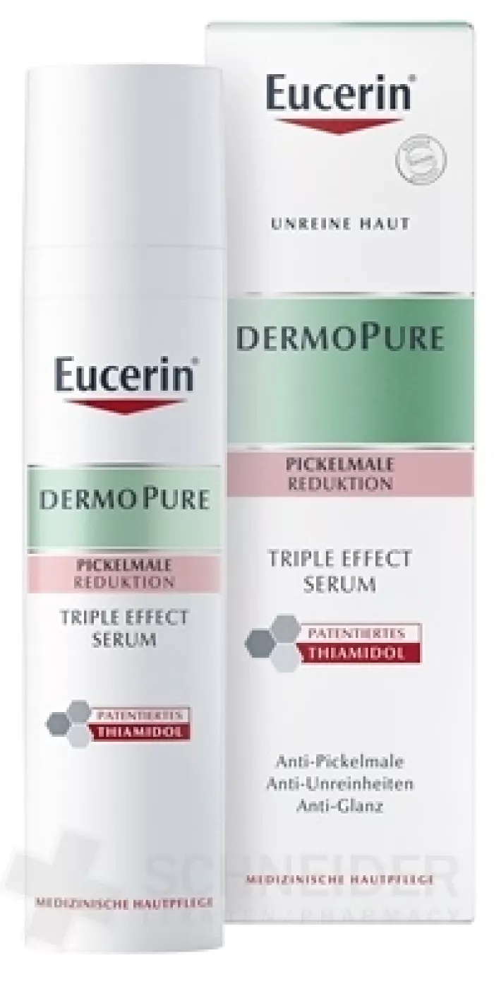 Kosmetisches Produkt für problematische Haut, Serum mit Dreifachwirkung. Enthält patentiertes Thiamidol. Es wirkt gegen Pigmentflecken nach Akne, gegen Hautunreinheiten und gegen Hautglanz.