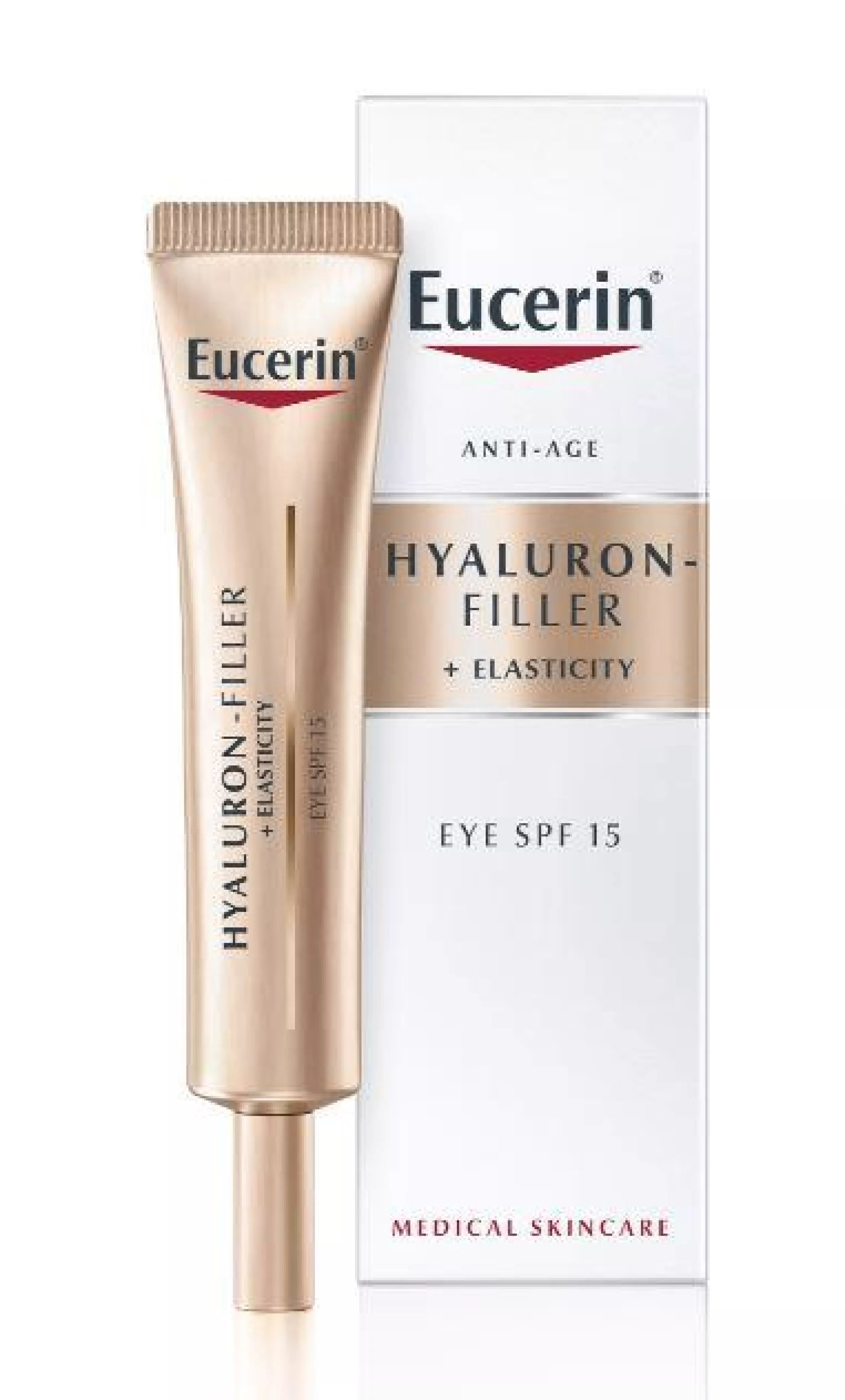 Die Augencreme enthält außerdem Lichtschutzfaktor 15 und einen UVA-Filter für einen erhöhten Schutz vor Sonnenlicht, das Falten vertiefen und den Hautalterungsprozess beschleunigen kann. Die Creme ist parfümfrei, nicht komedogen, augenärztlich getestet und auch für die Anwendung mit Kontaktlinsen geeignet. Die einzigartige Zusammensetzung bringt mehrere verjüngende Effekte mit sich. Darin verwendet die Marke Eucerin eine innovative Kombination aus hoch- und niedermolekularer Hyaluronsäure und Arctiin (ein Wirkstoff, der nachweislich die Erneuerung von Kollagen in Hautzellen beschleunigt), um eine sichtbare Auffüllung tiefer Falten und eine glattere, straffere Haut rund um die Haut zu erreichen Augen.