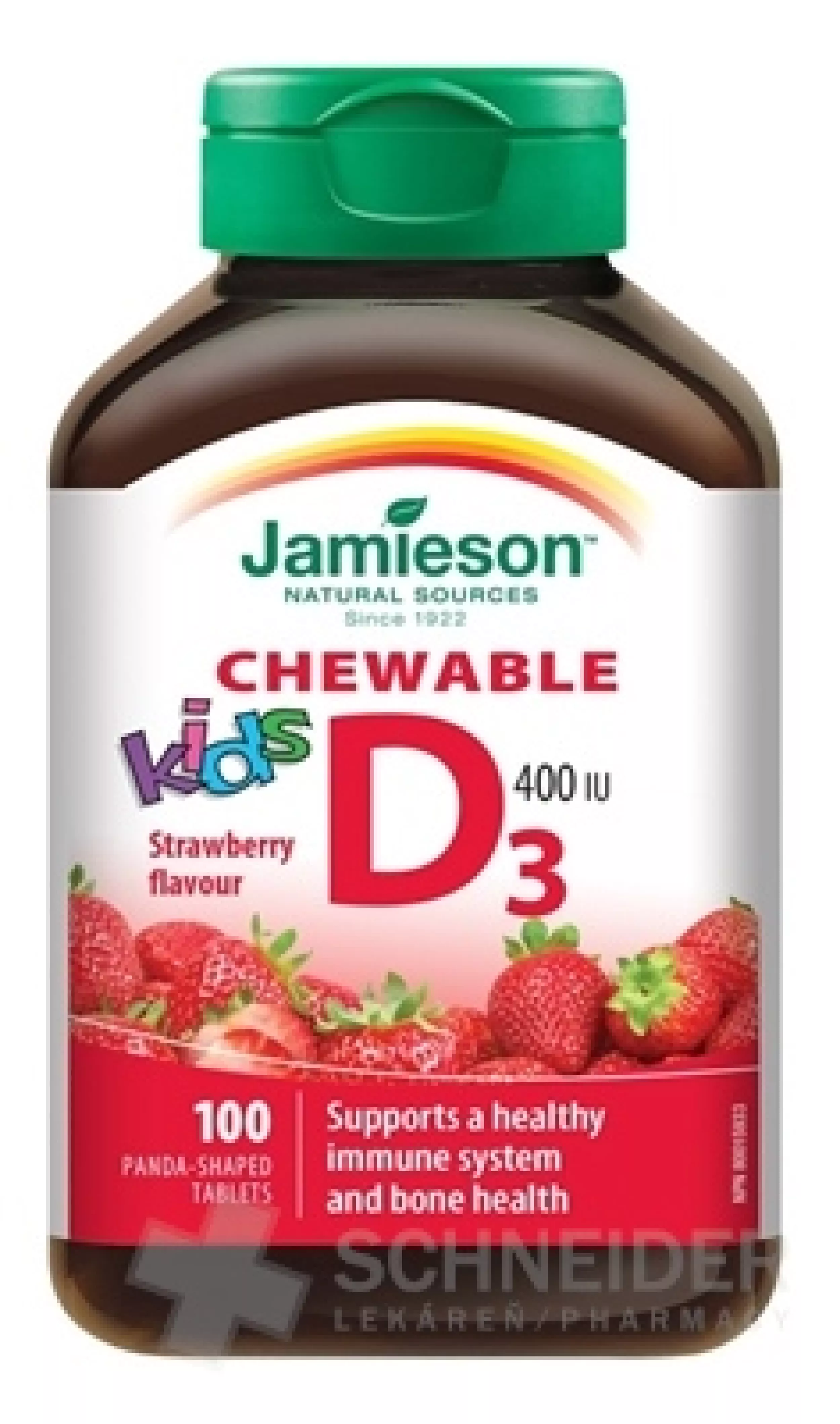 Vitamin D KIDS, Kinderpastillen mit Vitamin D3 mit köstlichem Erdbeergeschmack in Tablettenform in Form eines Pandabären. Es wird aus natürlichen Quellen hergestellt und enthält keine künstlichen Süßstoffe, Aromen, Farbstoffe oder Konservierungsstoffe.