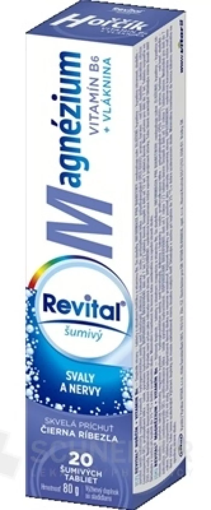 Nahrungsergänzungsmittel REVITAL® MAGNESIUM + VITAMIN B6 Brausetabletten mit schwarzem Johannisbeergeschmack, enthaltend Magnesium und Vitamin B6.