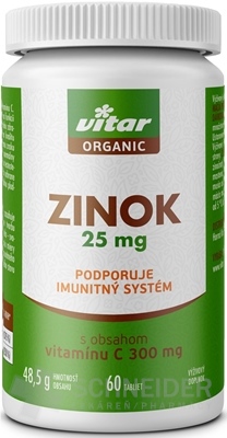 Nahrungsergänzungsmittel – Tabletten mit Vitamin C und Zink. Enthält eine erhöhte Dosis - 25 mg Zink und 300 mg Vitamin C. Hinweis für Diabetiker: Enthält keinen Zucker.